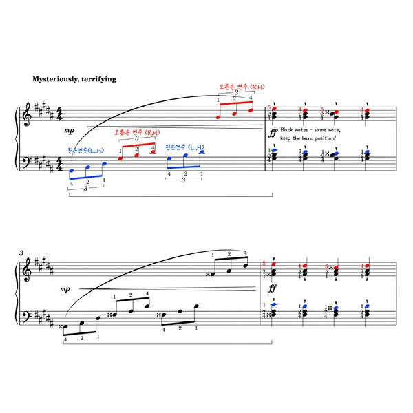 계이름, 손가락번호, 페달, 프레이즈 모두 적혀있으며,