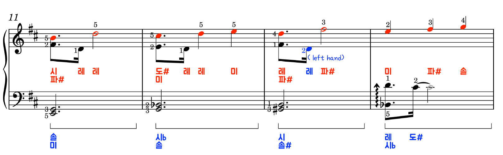 -계이름, 손번호, 페달이 모두 나와 있으며,