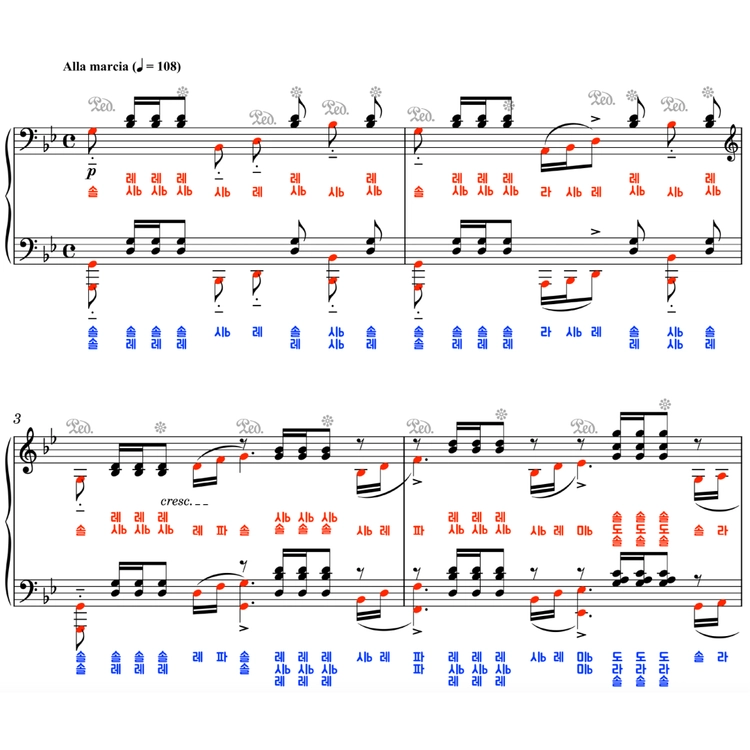 (계이름과 손가락번호, 페달, 셈여림, 다이나믹 모두 적혀있음)