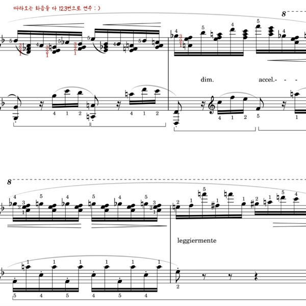(그냥 페달뿐만 아니라, 왼쪽페달 밟는 곳도 표시) - 셈여림, 프레이즈까지 모두 있어