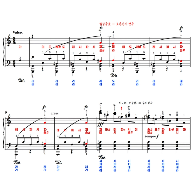 계이름과 손가락번호, 페달이 모두 표기되어 있으며
